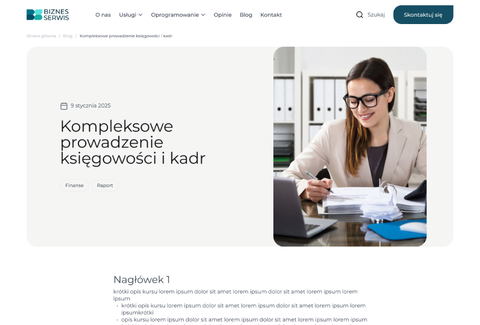 Nowa strona Biznes Serwis to kompleksowa platforma prezentująca usługi księgowe, prawne i ERP. Projekt obejmował analizę UX, stworzenie nowoczesnego designu, wdrożenie dynamicznych formularzy oraz sekcji blogowej i opinii klientów. Serwis został zoptymalizowany pod kątem SEO i szybkości działania. Strona jest w pełni responsywna, zintegrowana z narzędziami analitycznymi i gotowa do dalszej rozbudowy. To nie tylko wizytówka firmy, ale też skuteczne narzędzie marketingowe.