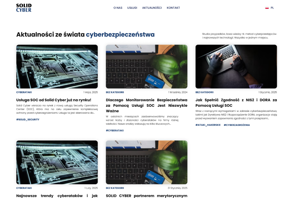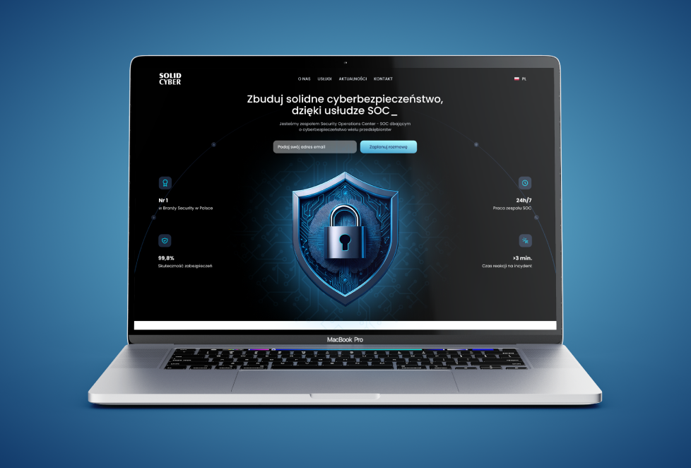 Dla Solid Cyber (Security Operations Center) zaprojektowaliśmy nowoczesną stronę-wizytówkę opartą na WordPressie. Zmodernizowaliśmy nieczytelną, przestarzałą witrynę, tworząc przejrzystą strukturę i nowoczesny design zgodny z identyfikacją wizualną marki. Dodatkowo opracowaliśmy profesjonalną ofertę w formie pliku PDF, którą firma może wykorzystywać w komunikacji z klientami.